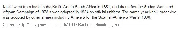 Le Khaki fut officialisé quelques années plus tard en 1884. Il représentait encore à ce moment là un pantalon de vêtement militaire et fut adopté comme tenue réglementaire par l’ensemble des troupes en Inde, puis dans tout l’empire britannique avant d’être repris comme la couleur standard par de nombreuses armées dans le monde.